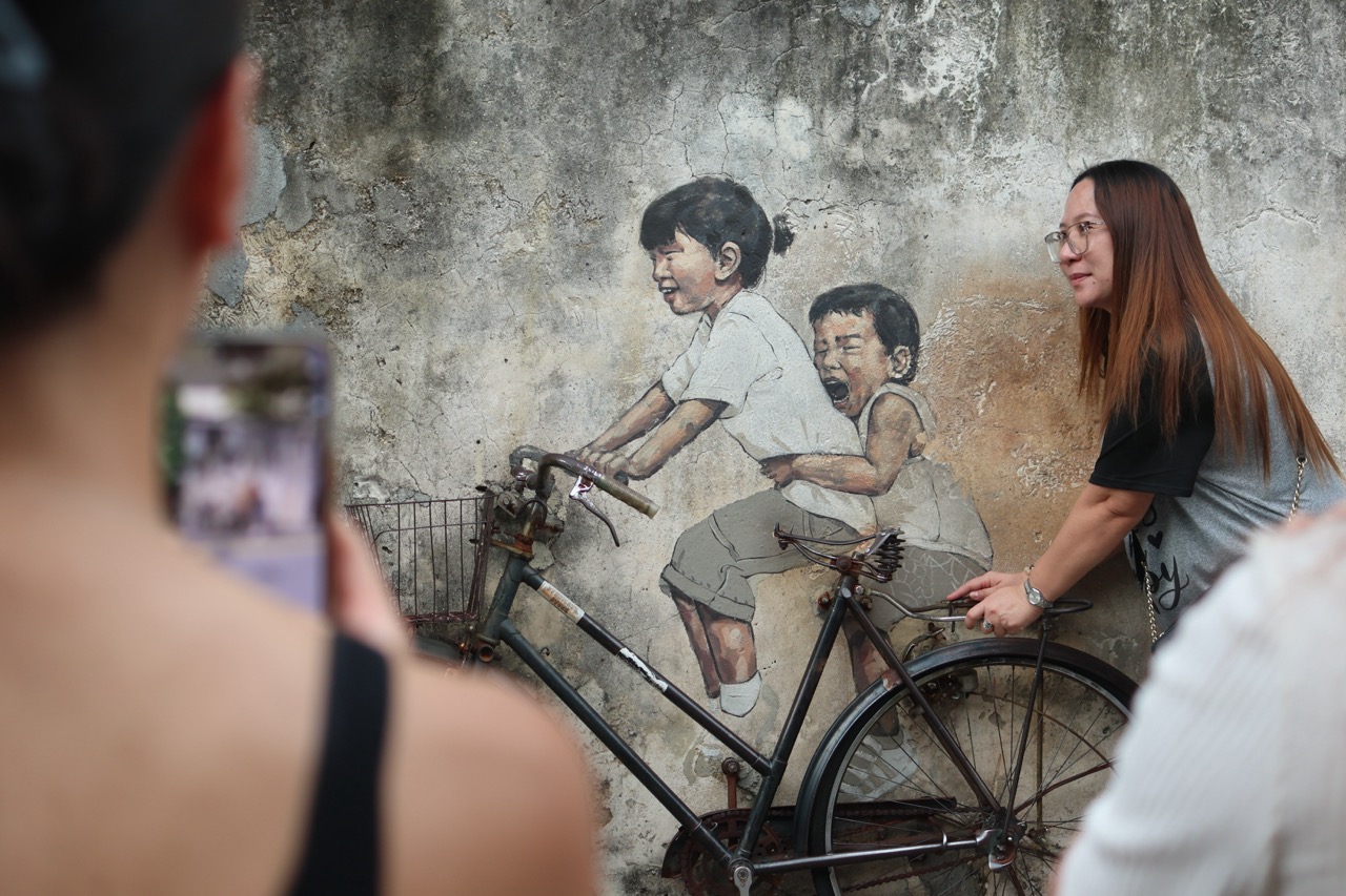 We embark from our 'Rose' room hotel at Kupang, a packed town at the base of the humble Mt Baling (564m), and were so excited to reach Georgetown we didn't stop for lunch. Before 1pm we had covered 76km in four hours (previously 4 hours got us 50kms, but just remember this is Huy's first ever big bike ride, having done a maximum of 40kms before this!). Taking a ferry across to Georgetown was easy and relaxing compared to our last ferry crossing experience from Singapore to Malaysia. We zip to our hotel, The Georgetown Green Gates, situated right in the old town in a beautifully restored cultural heritage building. It was adorned with porcelain vases and each wall fitted with contemporary paintings in heavy wooden frames. We felt in total luxury, but the hotel was not that much more expensive than the 'Rose' room on the highway in Kupang (ripper deal on Agoda). Riding around, we realised it was perfect timing to visit Georgetown as it was low season; cheaper accommodation and less-packed streets.