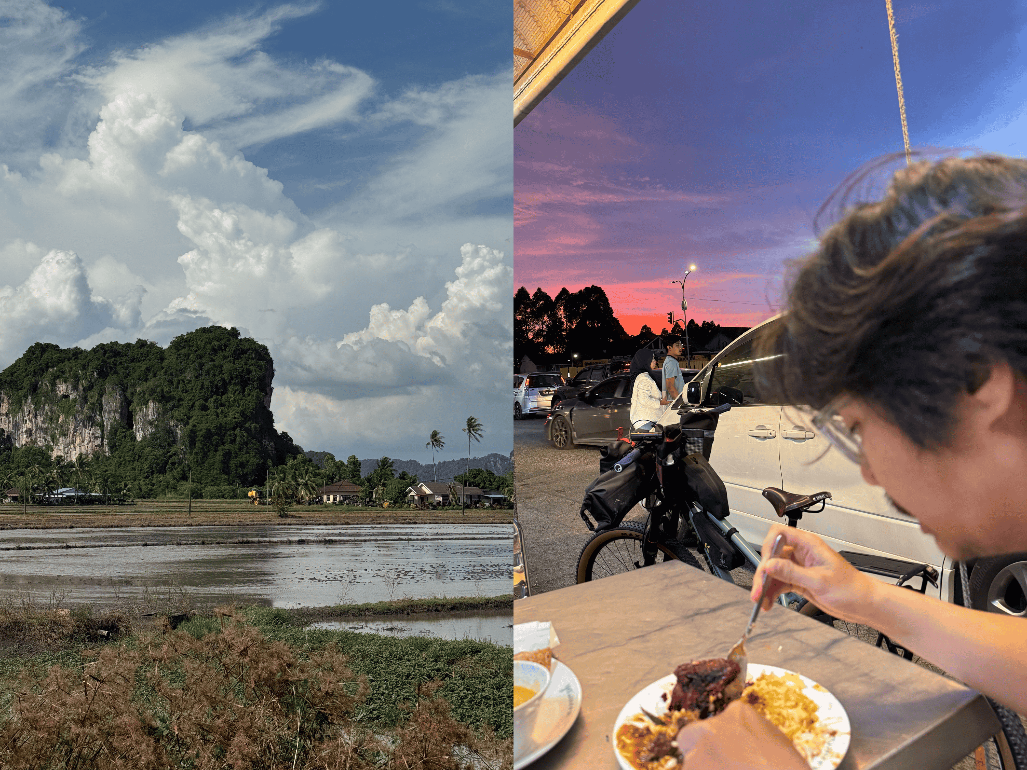 The landscape changed immensely, from forested areas and plantations of oil palm and rubber trees to now open flat rice fields with karst limestone hills jutting out. Migratory birds flew high above and we would witness dozens of egrets congregating near tractors, eagerly awaiting delicious snacks from the churning of the soil. We stop for two days in Arau in a little room stay amongst the rice paddies for RM80 (AUD 30) a night. We were given another taste of scrumptiousness with the best nasi kandar and a taste of home with laksa from Sarawak.